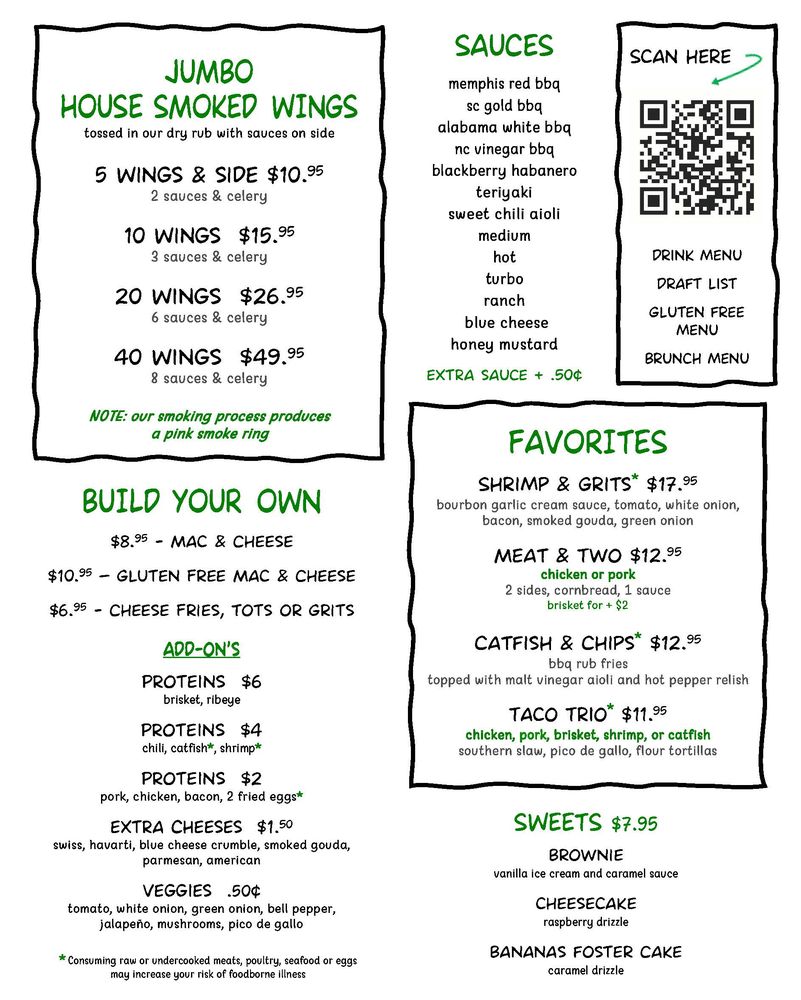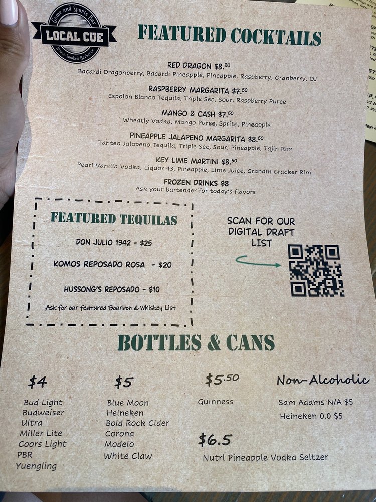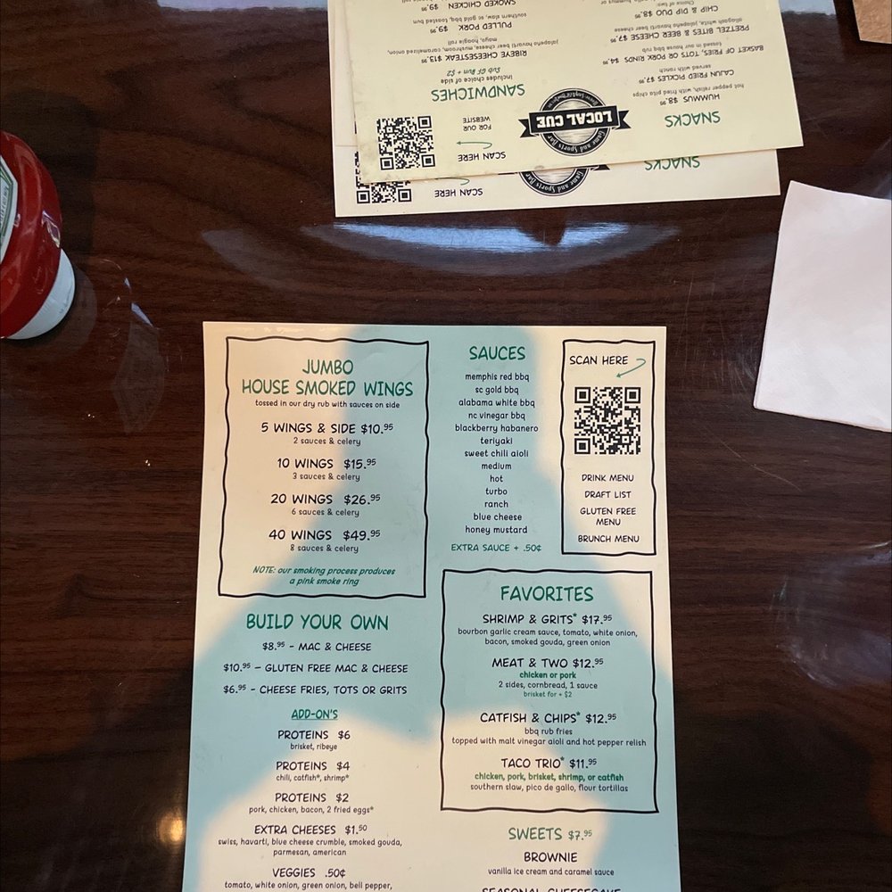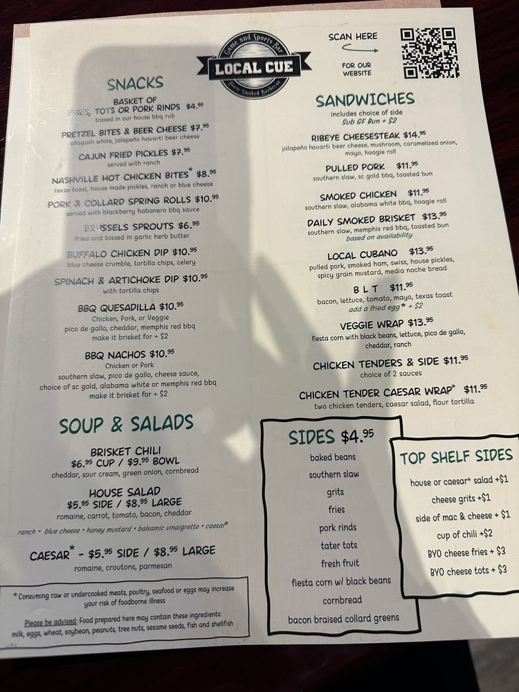 Introducing the menu at Local Cue, a vibrant barbeque spot in Greenville, SC, offers a variety of dishes to satisfy your cravings. From hearty sandwiches like the B L T Bacon and Daily Smoked Brisket to flavorful snacks like Buffalo Chicken Dip and Cajun Fried Pickles, there's something for everyone. Their Brisket Chili and House Salad are also must-tries. The welcoming atmosphere is enhanced by amenities like free Wi-Fi, TV, and outdoor seating. Customers rave about the exceptional service and family-friendly environment, making it a go-to spot for gatherings and casual dining. With a diverse menu, creative twists on classic dishes, and a lively ambiance, Local Cue is a standout destination for delicious food and good times.